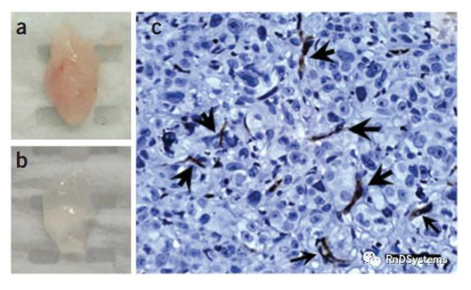 (a,c)用100μL 基質(zhì)膠混合2x105 PC3細(xì)胞,接種到SCID小鼠中9天后血管和腫瘤細(xì)胞的生長(zhǎng)情況,(c)箭頭所指為CD31標(biāo)記的表皮細(xì)胞,顯示了腫瘤內(nèi)廣泛的血管形成。(b)為不加PC3細(xì)胞的對(duì)照。