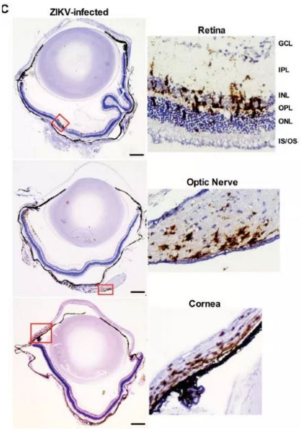 在病毒定位研究中,2015 年巴西寨卡病毒(Zika)爆發時,華盛頓醫科大學 Jonathan J. Miner 為首的研究團隊即通過 RNAscope 方法檢測到寨卡病毒在視網膜,視神經和角膜中的分布,直觀給出了該病毒在眼內的分布圖(見下圖,病毒陽性信號為圖中的棕色信號點)[1]。