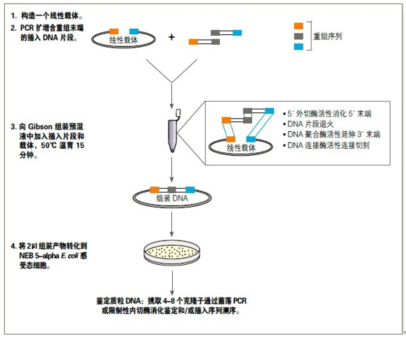 Gibson 組裝試劑盒中,包含 NEB 5-alpha E. coli 感受態細胞,經過優化,該試劑盒在一個試管中經等溫反應,可以高效的將 1 或 2 個組裝片段插入到任何載體,完成組裝和克隆。更多詳細信息請參考 2013﹒2014