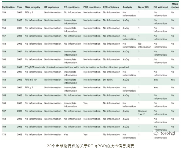 結果再現性問題2013年,《自然》(Nature)雜志發表的一篇論文綜述得出結論,自MIQE指南發布以來,有關RT-qPCR方案的必要信息的報告實際上有所惡化。雖然指南強烈建議納入必要的技術信息,但分析的10篇論文中沒有一篇報道了這一信息。這意味著沒有向讀者提供任何有關RNA完整性、RNA純度、RT條件或PCR效率的信息,而且所有的出版物都使用了一種不恰當的數據分析方法,這種方法在15年前已經被質疑。作者對《自然》雜志的20篇近期論文進行了重復分析,得出了基本相同的結論。更諷刺的是,報道透明度與期刊的影響因子呈負相關。