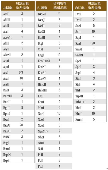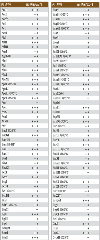 0.13 單位的酶量;表中標注有“++/+” 的酶是具有中等活性的延時內切酶,16 小時完全酶切
