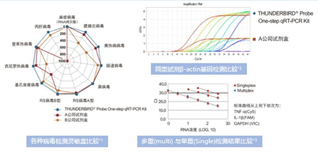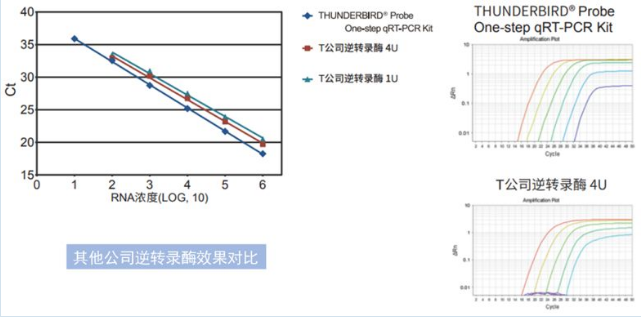 以檢測Flu病毒為例,模板拷貝數從101~106數量級,THUNDERBIRD?Probe One-step qRT-PCR Kit按標準體系進行,T公司的逆轉錄酶從1U增加到 4U,定量效果依然到不到本試劑盒效果。