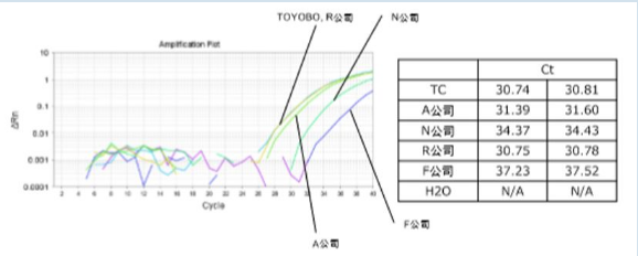 右圖,比較了檢測腸病毒RNA時Ct值。使用TOYOBO的UNG條件時檢測靈敏度沒有問題,使用其他公司的產品時Ct值出現了延遲。