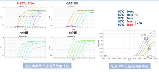 左圖,使用TaqMan探針法檢測不同濃度流感病毒樣本。首先抽提RNA進行梯度稀釋(1x10^2 ~ 1x10^8),以相同條件檢測比較同類試劑盒檢測靈敏度。QRT為使用TTh酶的一步法定量試劑,可見HSTTX酶在處理實際樣本時效果最好。