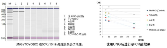 左圖,對比其他公司宣稱的熱敏性產品,50℃ 10分鐘處理后,將各UNG酶與含有U的PCR產物混合后37度進行溫育。只有TOYOBO的UNG在50度10分鐘處理后失去活性,沒有分解掉含有U的PCR產物。