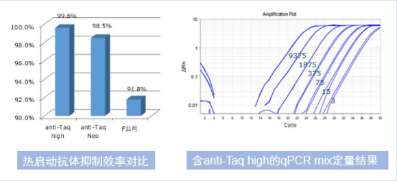 anti-Taq high是針對Taq DNA聚合酶的單克隆中和抗體,使用抗體熱啟動法可以有效抑制非特異性擴增,增強PCR的特異性和靈敏度。在進入PCR循環前的預變性階段,Taq酶的活性即被完全激活,使用起來方便快速。此外,可提供用于凍干的無甘油版本。