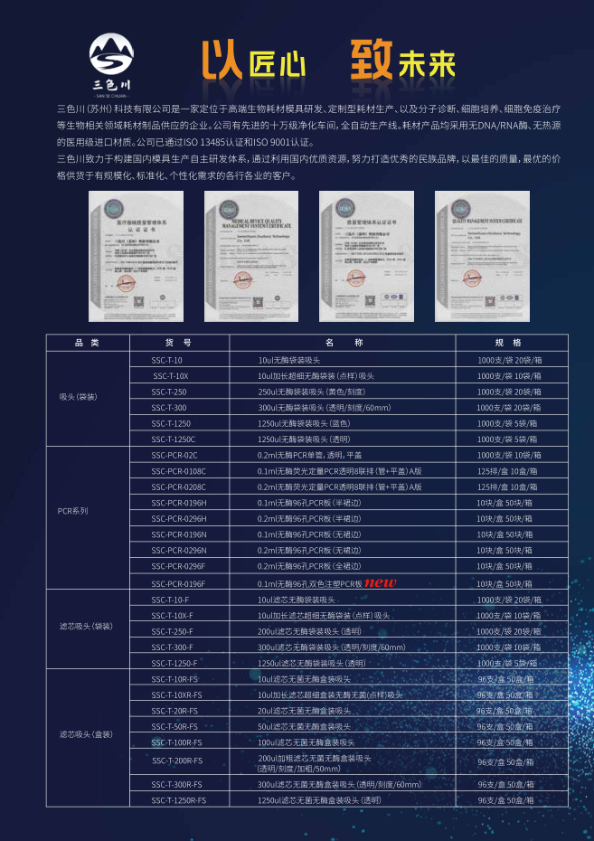 三色川(蘇州)科技有限公司是一家定位于高端生物耗材模具研發(fā)、定制型耗材生產(chǎn)、以及分子診斷、細(xì)胞培養(yǎng)、細(xì)胞免疫治療等生物相關(guān)領(lǐng)域耗材制品供應(yīng)的企業(yè)。公司有先進的十萬級凈化車間,全自動生產(chǎn)線。耗材產(chǎn)品均采用無DNA/RNA酶、無熱源的醫(yī)用級進口材質(zhì)。公司已通過ISO 13485認(rèn)證和ISO 9001認(rèn)證。